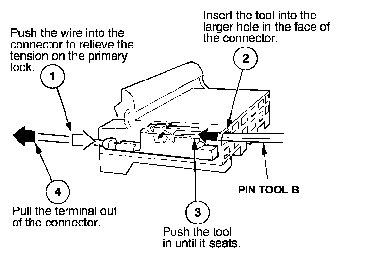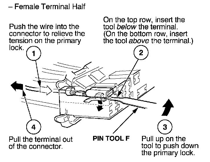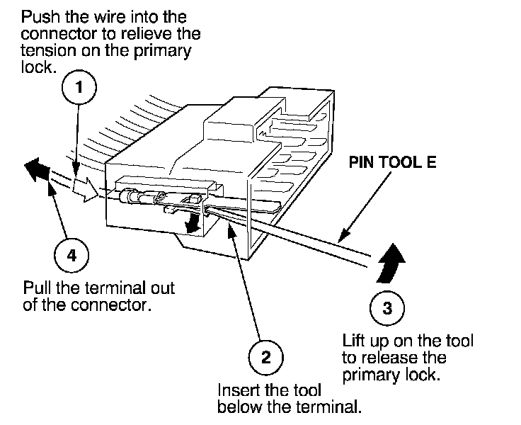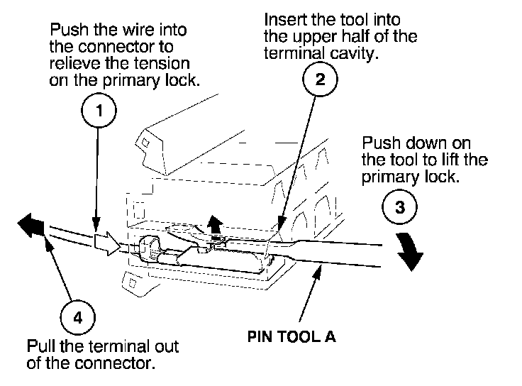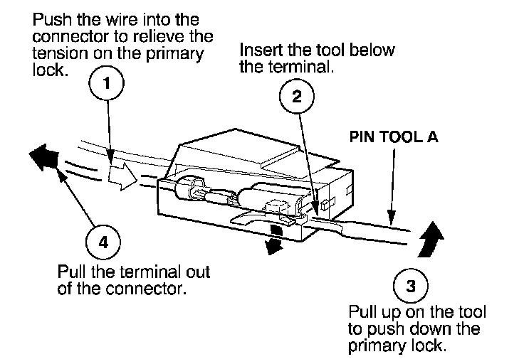Before you begin, inspect the wire you are about to repair for damage and length. Make sure the wire will be long enough to make a terminal repair without stretching it when you reinstall the terminal in the connector. If the wire is too short, or if access to the connector is too restricted to make a terminal repair, you may need to install a pigtail terminal (a short length of wire with a factory-crimped terminal on it). Refer to HOW TO INSTALL PIGTAIL TERMINALS.
