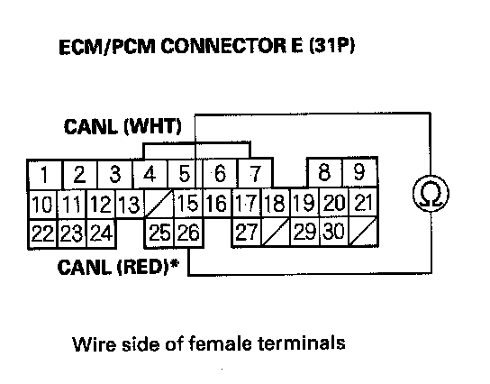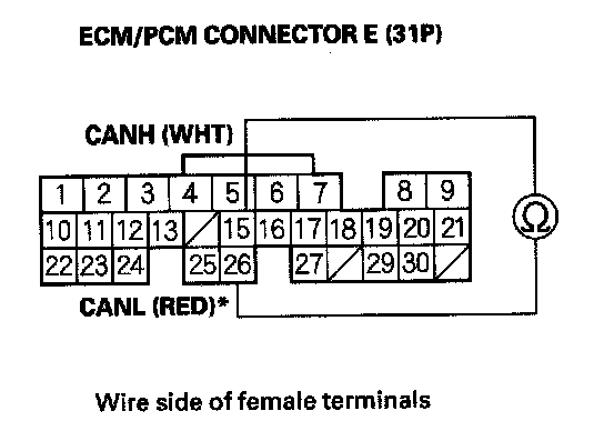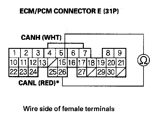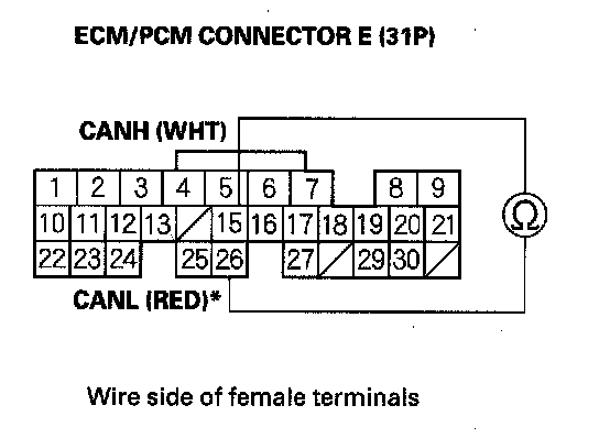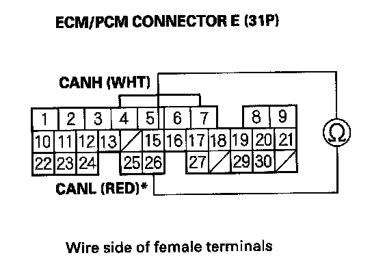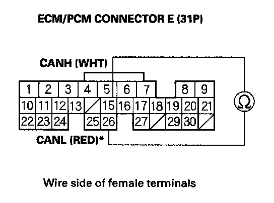31. Measure resistance between ECM/PCM connector terminals E15 and E26*.