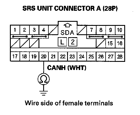 15. Check for continuity between SRS unit connector terminal A20 and body ground.