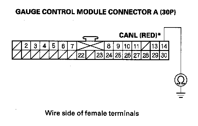 21. Check for continuity between gauge control module connector terminal A14 and body ground.