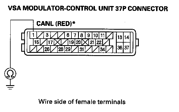 22. Check for continuity between VSA modulator-control unit 37P connector terminal No. 1 and body ground.
