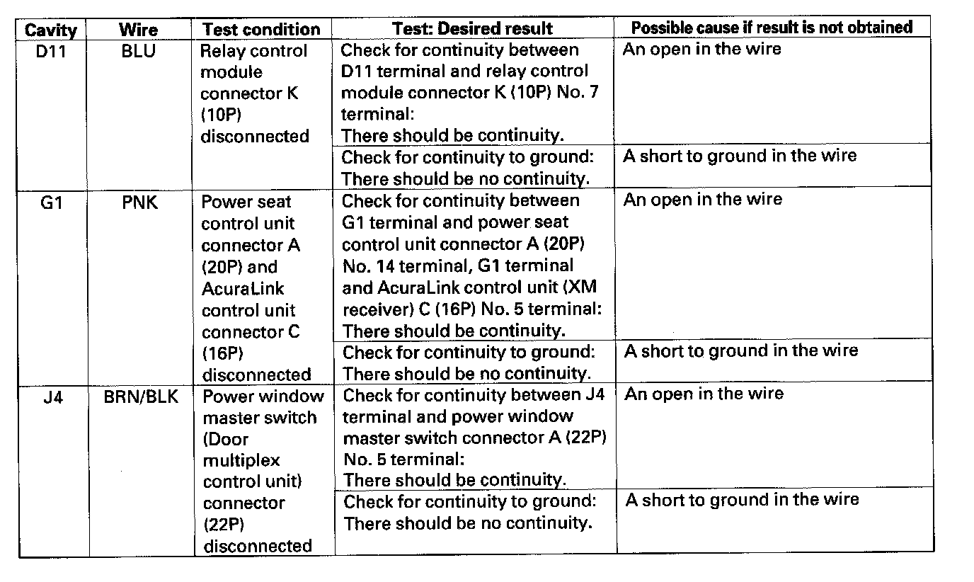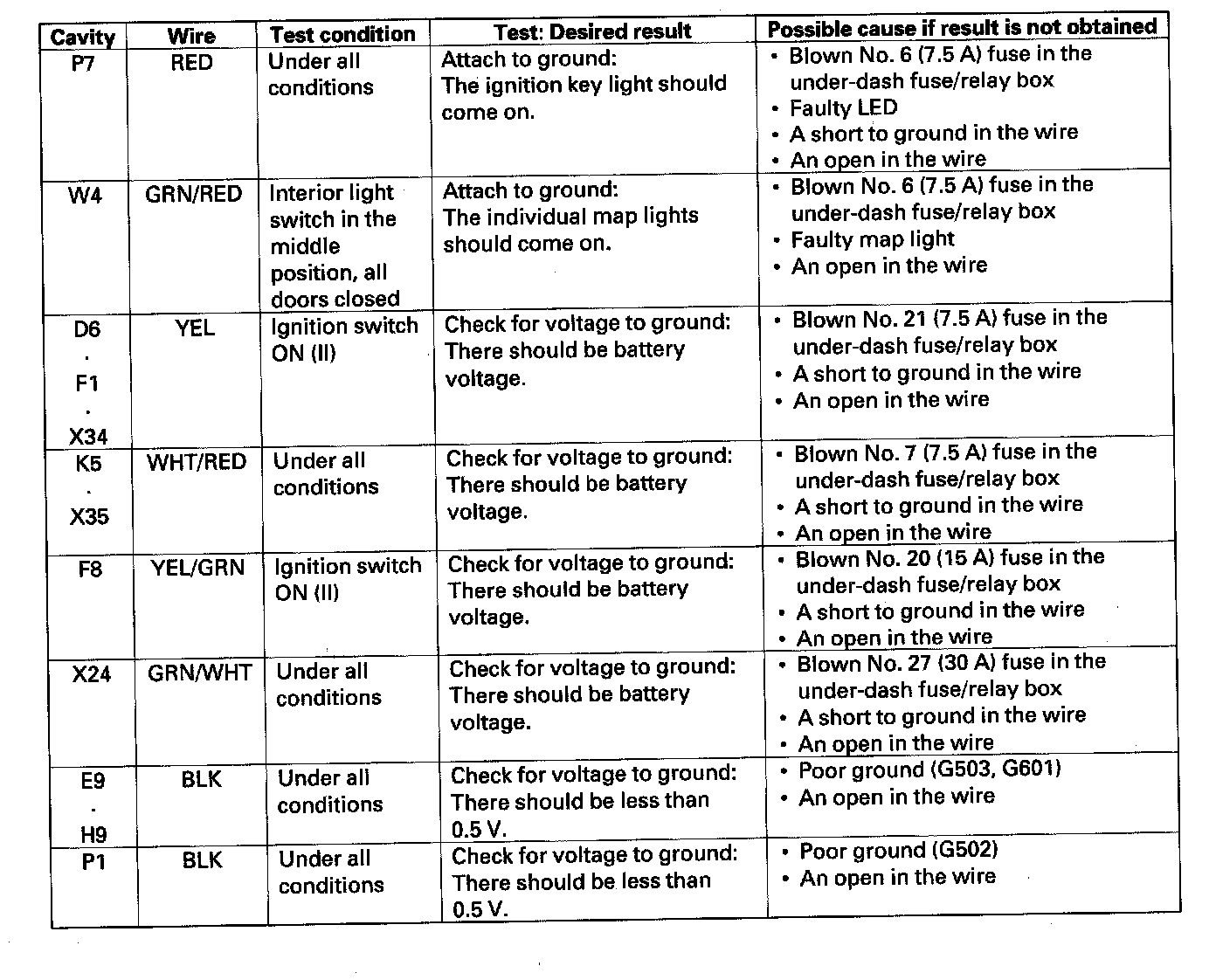 5. Reconnect the connectors to the under-dash fuse/relay box, and make sure these input tests at the appropriate connectors on the under-dash fuse/relay box.