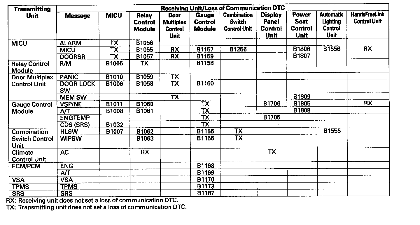 When an ECU is unable to communicate with the other ECUs on the circuit, the other units will set loss of communication DTCs. Use this chart to find the control unit that is not communicating.