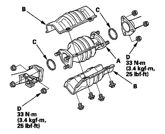Install the parts in the reverse order of removal with new gaskets (C) and new self-locking nuts (D).