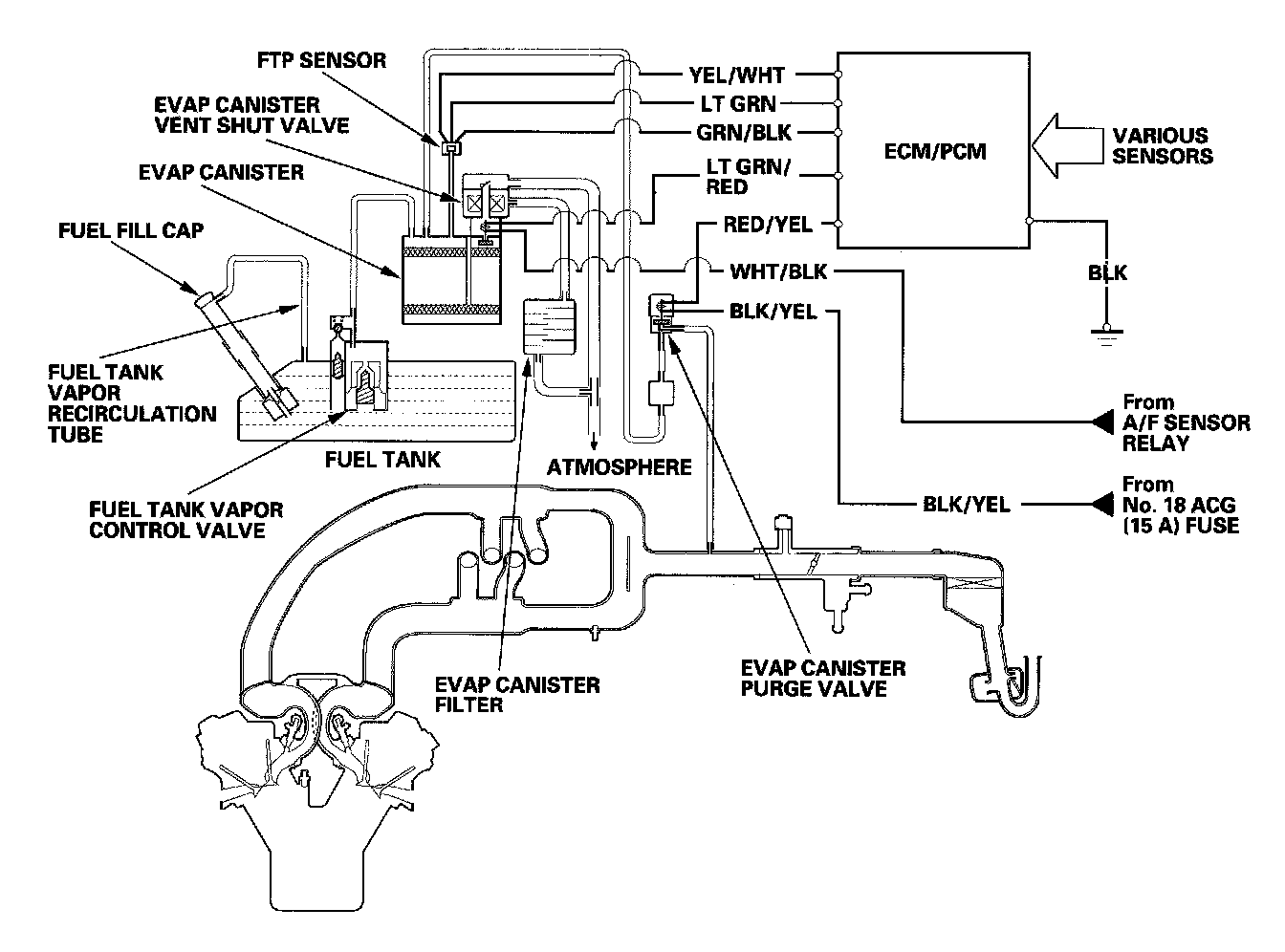 The EVAP controls minimize the amount of fuel vapor escaping to the atmosphere. Vapor from the fuel tank is temporarily stored in the EVAP canister until it can be purged from the canister into the engine and burned.