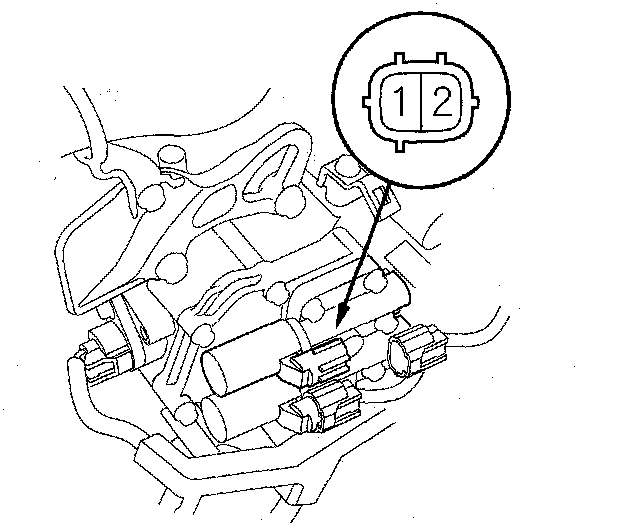 20. Connect a jumper wire from the negative battery terminal to A/T clutch pressure control solenoid valve A connector terminal No. 2, and connect a jumper wire from the positive battery terminal to connector terminal No. 1. Make sure A/T clutch pressure control solenoid valve A moves.
