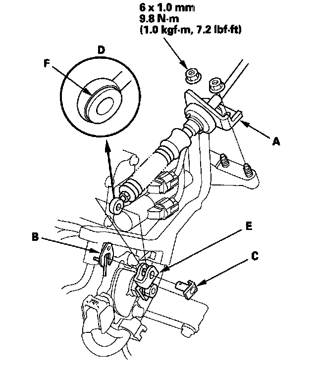 15. Check the synthetic resin bushing (F) in the shift cable end for proper fit and wear. If the bushing is loose or worn, replace the shift cable.