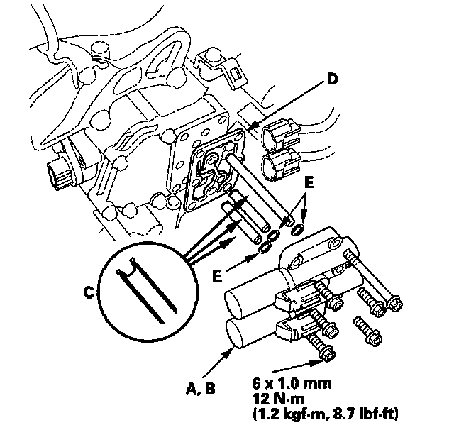 18. Remove A/T clutch pressure control solenoid valves A and B, ATF pipes (C), gasket (D), and O-rings (E).