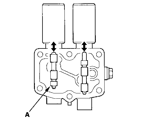 21. Disconnect one of the jumper wires and check the valve movement at the fluid passage in the valve body mounting surface. If the valve binds or moves sluggishly, or if the solenoid valve does not operate, replace A/T clutch pressure control solenoid valves A and B.