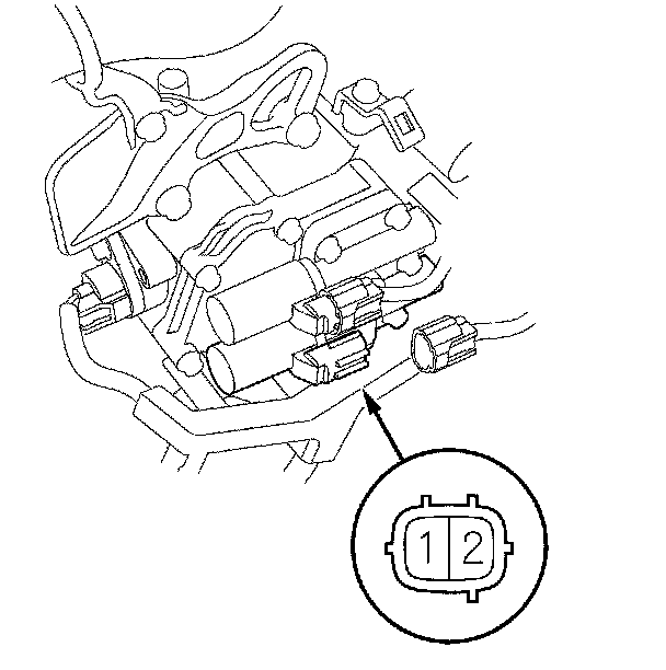 20. Connect a jumper wire from the negative battery terminal to A/T clutch pressure control solenoid valve B connector terminal No. 2, and connect a jumper wire from the positive battery terminal to connector terminal No. 1. Make sure A/T clutch pressure control solenoid valve B moves.