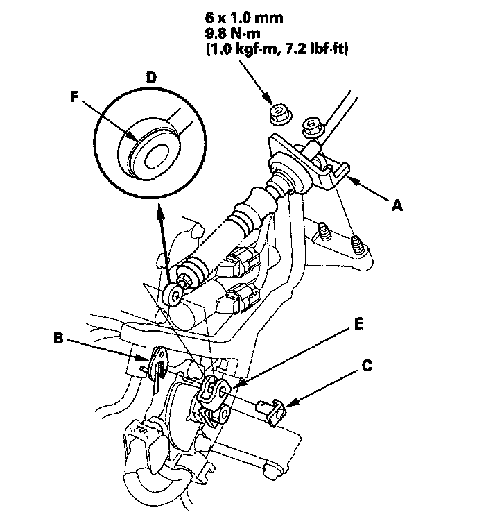 15. Check the synthetic resin bushing (F) in the shift cable end for proper fit and wear. If the bushing is loose or worn, replace the shift cable.
