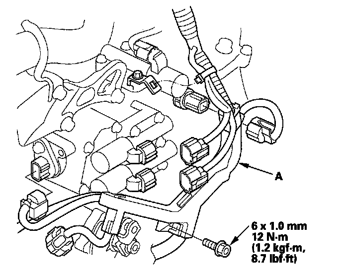 16. Disconnect the connectors from A/T clutch pressure control solenoid valves A, B, solenoid harness, transmission range switch, ATF temperature sensor, output shaft (countershaft) speed sensor, input shaft (mainshaft) speed sensor, 3rd clutch transmission fluid pressure switch, and 4th clutch transmission fluid pressure switch.