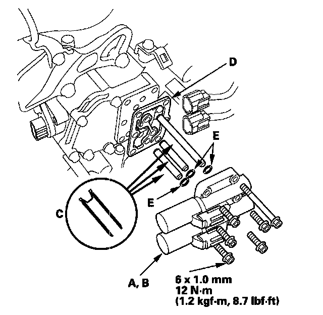18. Remove A/T clutch pressure control solenoid valves A and B, ATF pipes (C), gasket (D), and O-rings (E).
