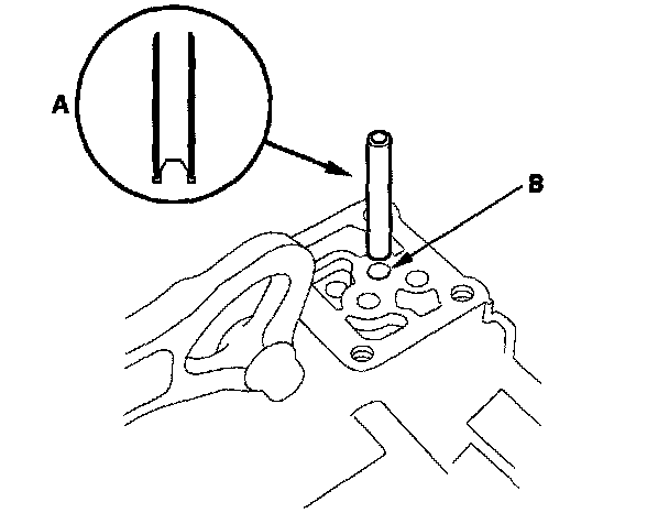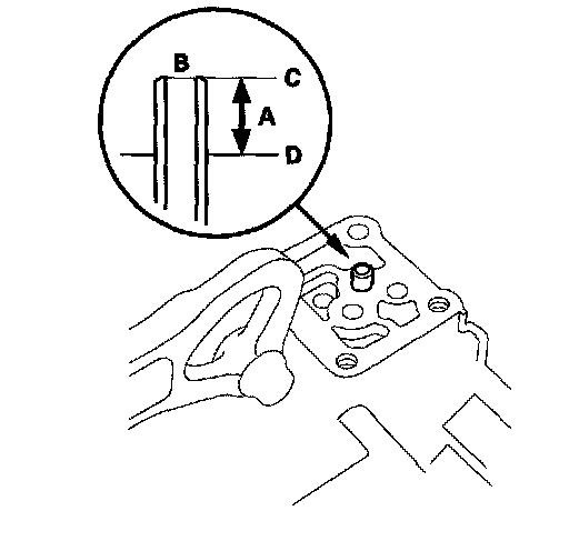 16. Check the height (A) of the 8 x 53 mm ATF joint pipe (B) between the top (C) of the pipe and the solenoid valve body mounting surface (D). The height is about 7 mm (0.3 in.). If the height is over 7 mm (0.3 in.), push the pipe until it bottoms in the accumulator body.
