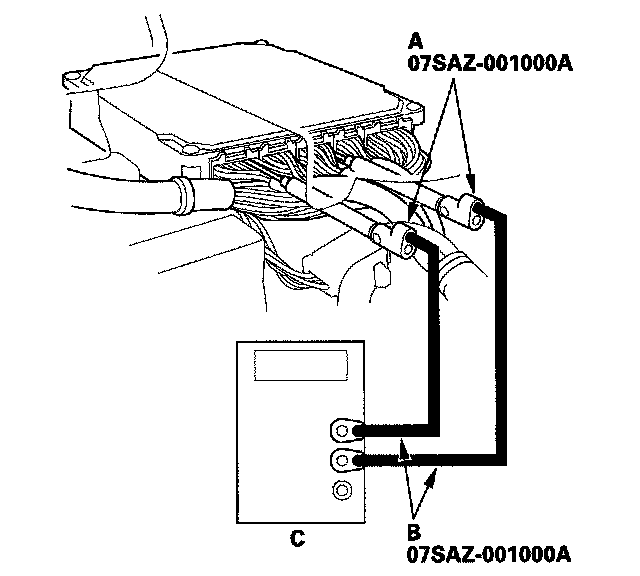 3. Connect the backprobe adapters (A) to the stacking patch cords (B), and connect the cords to a multimeter (C).