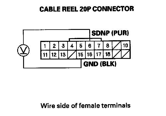 9. Measure the voltage between cable reel 20P connector terminals No. 6 and No. 15.