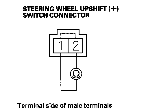 4. Check for continuity between the steering wheel upshift (+) switch connector terminals while pressing the switch and when the switch is released.