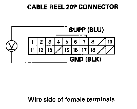 9. Measure the voltage between cable reel 20P connector terminals No. 5 and No. 15.