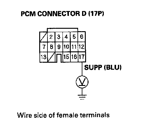 10. Measure the voltage between PCM connector terminal D17 and body ground.