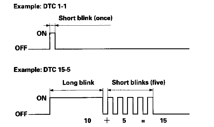 2. Turn the ignition switch ON (II), select SCS mode, then observe the D indicator in the gauge control module. Codes 1 through 9 are indicated by individual short blinks. Codes 10 and above are indicated by a series of long and short blinks. One long blink equals 10 short blinks. Add the long and short blinks together to determine the code.
