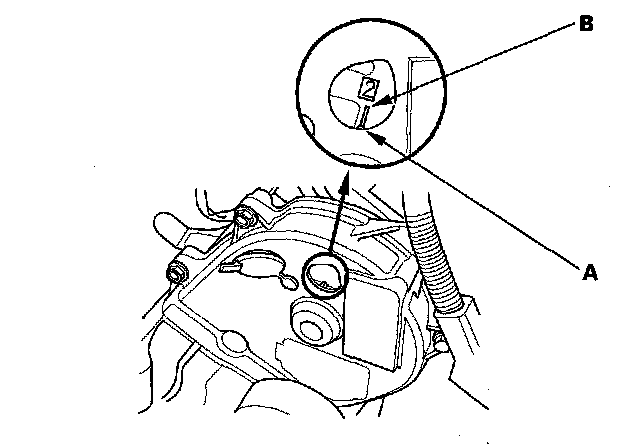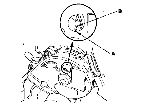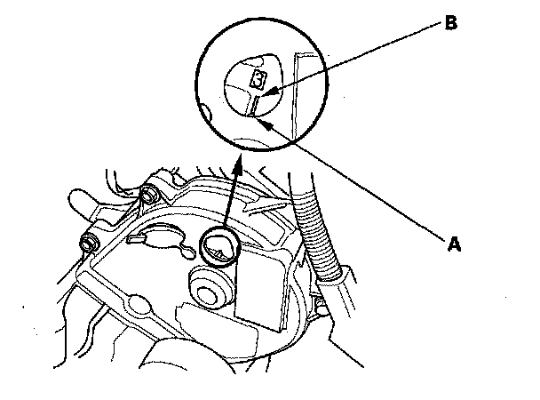 3. Set the No. 1 piston at top dead center (TDC). Align the pointer (A) on the front upper cover with the No. 1 piston TDC mark (B) on the front camshaft pulley.
