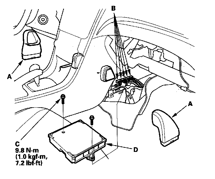 13. Remove the bolts (C), then remove the ECM/PCM (D).