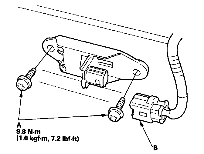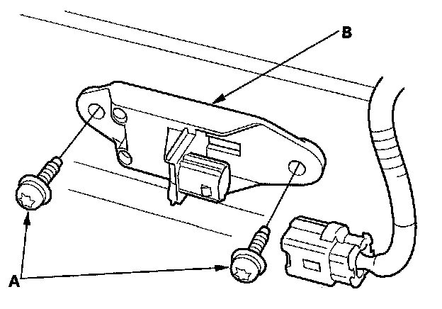 1. Install the new side impact sensor (first) with TORX bolts (A), then connect the floor wire harness 2P connector (B) to the side impact sensor (first).