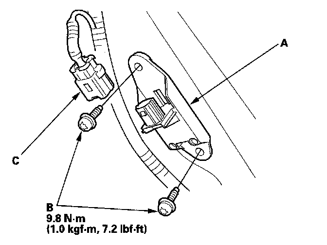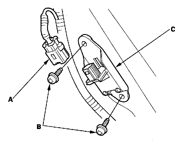 1. Install the new side impact sensor (second) (A) with TORX bolts (B) then connect the side curtain airbag harness 2P connector (C) to the side impact sensor.