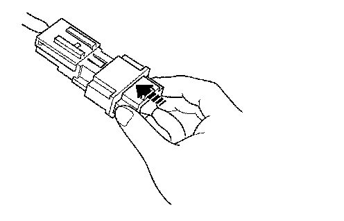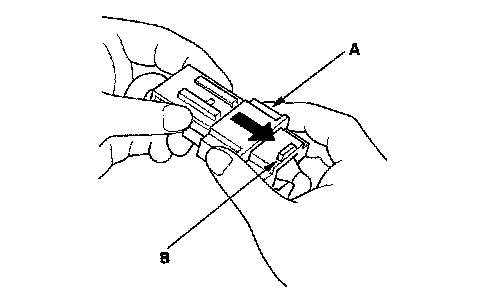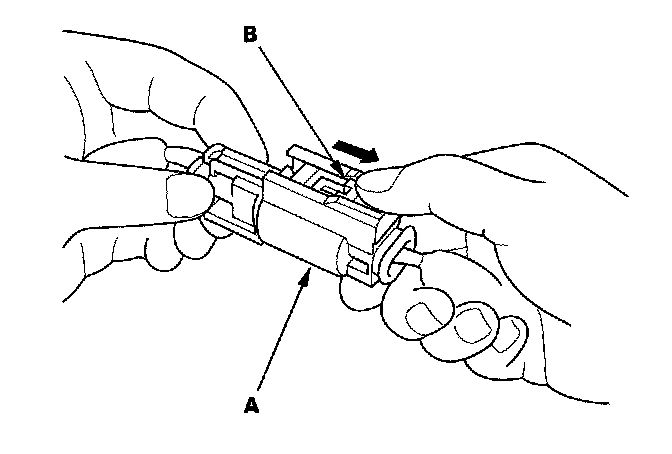 1. To reconnect, hold the pawl-side connector, and press on the back of the sleeve-side connector in the direction shown. As the two connector halves are pressed together, the sleeve (A) is pushed back by the pawl (B). Do not touch the sleeve.