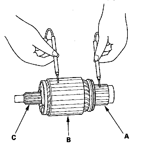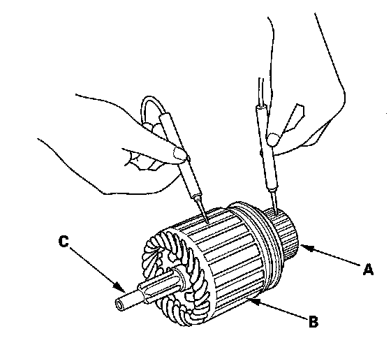 13. Use an ohmmeter to check for continuity between the commutator (A) and the armature coil core (B), and between the commutator and the armature shaft (C). If there is continuity, replace the armature.