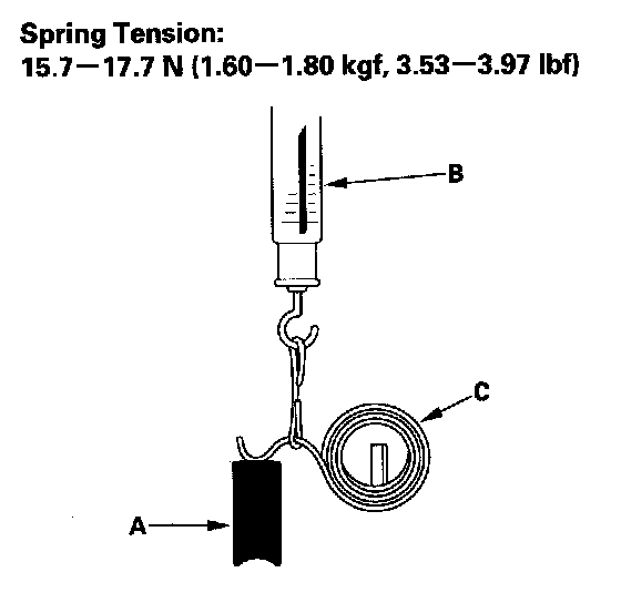 13. Insert the brush (A) into the brush holder, and bring the brush into contact with the commutator, then attach a spring scale (B) to the spring (C). Measure the spring tension at the moment the spring lifts off the brush. If the spring tension is not within specification, replace the spring.