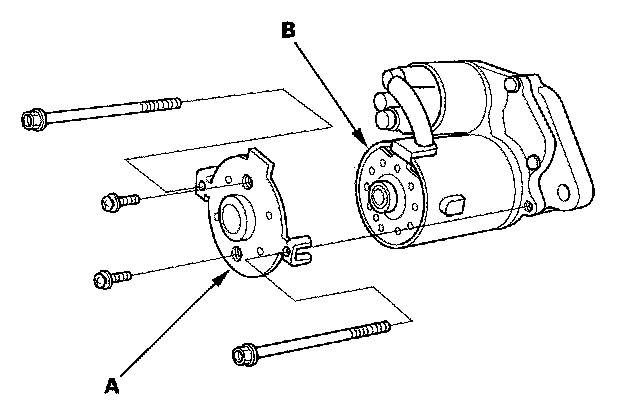 16. Install the starter end cover (A) to retain the brush holder (B).