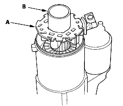 19. If the starter drive gear (B) is worn or damaged, replace the overrunning clutch assembly; the gear is not available separately. Check the condition of the idler gear and torque converter ring gear to see if the starter drive gear teeth are damaged.