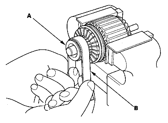 4. Check the commutator (A) surface. If the surface is dirty or burnt, resurface it with an emery cloth or a lathe to the following specifications, or recondition with #500 or #600 sandpaper (B).