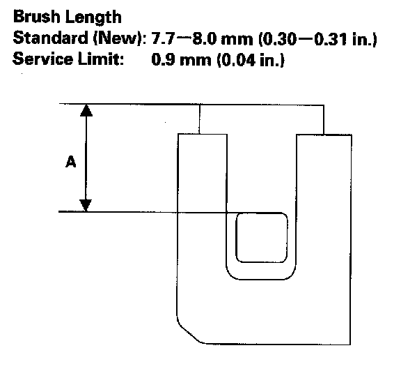 14. Measure the brush length (A). If it is shorter than the service limit, replace the brush holder assembly.
