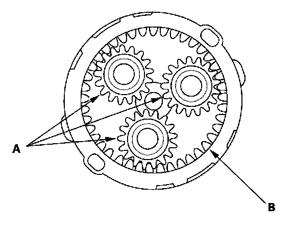 16. Check the planetary gears (A) and internal gear (B). Replace them if they are worn or damaged.