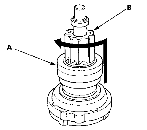 18. Rotate the overrunning clutch (A) in both directions. It should lock and move upward in one direction and rotate smoothly in the other direction. If it does not lock in either direction, or if it locks both directions, then replace it.