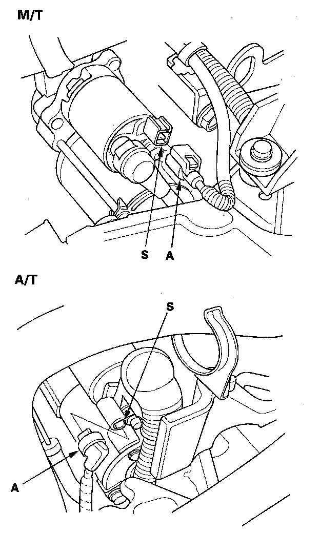 - A/T model: The BLK/WHT wire and connectors between starter cut relay 2 and the starter