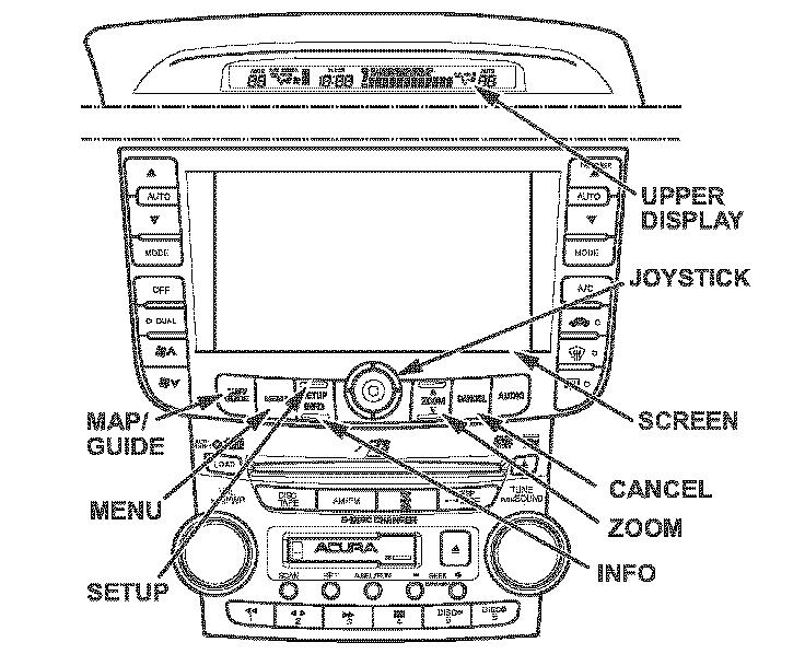 Upper display - This display provides the time and basic audio and climate control settings, even when the navigation system is not being used. The time is set from GPS signals and is accurate to within a second. This time can be adjusted in Setup. See the owner's manual for information on the audio and climate control portions of the display.
