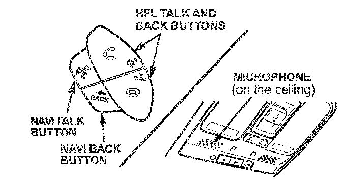 Microphone - Receives voice commands and transmits them to the navigation unit for interpretation. The navigation system communicates through the front audio speakers. When the navigation system is giving guidance instructions, the front speakers are muted, and the audio continues in the rear. When you are using the voice control system to give commands (by pressing the TALK or BACK buttons), all of the speakers are muted. If the HFL (HandsFreeLink) is in use, the voice control system is unavailable, and an error message is displayed on the screen.