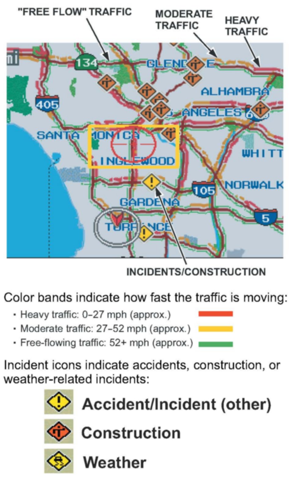 Traffic information is available in many metropolitan areas. The amount and type of coverage varies. Traffic incidents (diamond-shaped icons) are shown on the screen for most major metropolitan cities (typically during daytime commutes). Many of these cities also display traffic flow, shown as red, orange, or green bands alongside major roads or freeways.