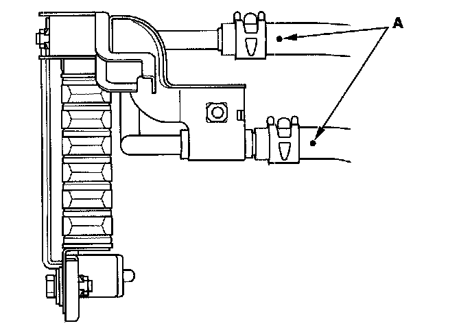 3. At the joints (A) under the radiator, secure the hoses with the clips (B) at 2-41 mm (0.08-0.16 in.) (C) from the hose ends.