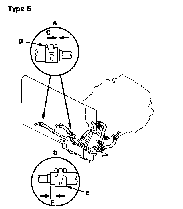 2. Type-S: Align the marks (A) on the ATF cooler hoses of the air cooled ATF cooler as shown.
