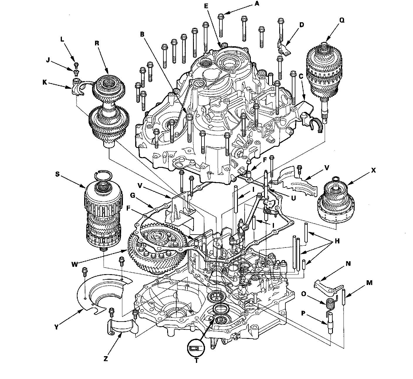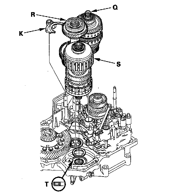 31. Remove the mainshaft (Q), countershaft (R), shift fork, and secondary shaft (S) together, and remove the needle bearing (T) from the torque converter housing.