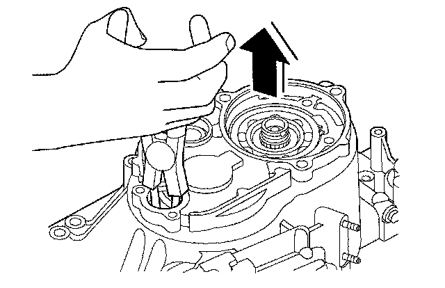 24. Release the pliers, and remove the transmission housing, two dowel pins (F), and gasket (G).