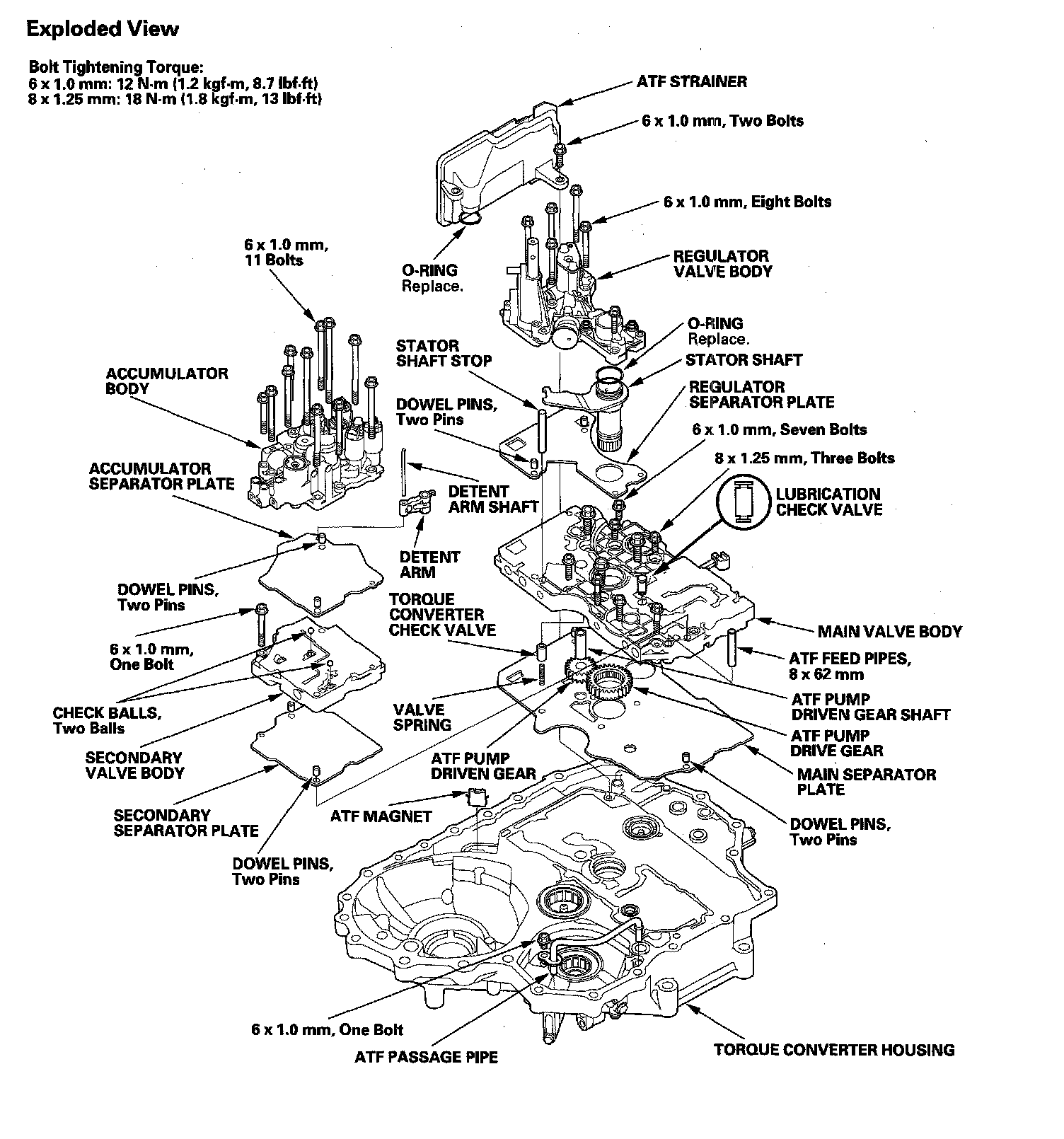 11. Install the 8 x 62 mm ATF feed pips in the main valve body, and install the accumulator body 1 bolts).