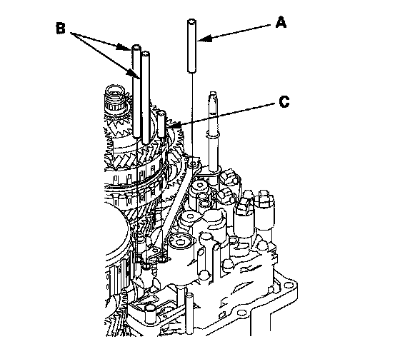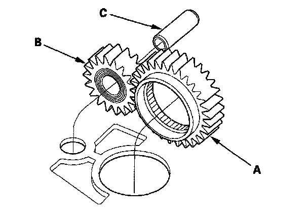2. Install the main separator plate and two dowel pins on the torque converter housing. Then install the ATF pump drive gear (A), driven gear (B), and ATF pump driven gear shaft (C). Install the ATF pump driven gear with its grooved and chamfered side facing down.