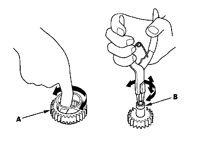 4. Install the main valve body (seven 6 mm bolt and three 8 mm bolts). Make sure the ATF pump drive gear (A) rotates smoothly in the normal operating direction, and the ATF pump driven gear shaft (B) moves smoothly in the axial and normal operating direction.