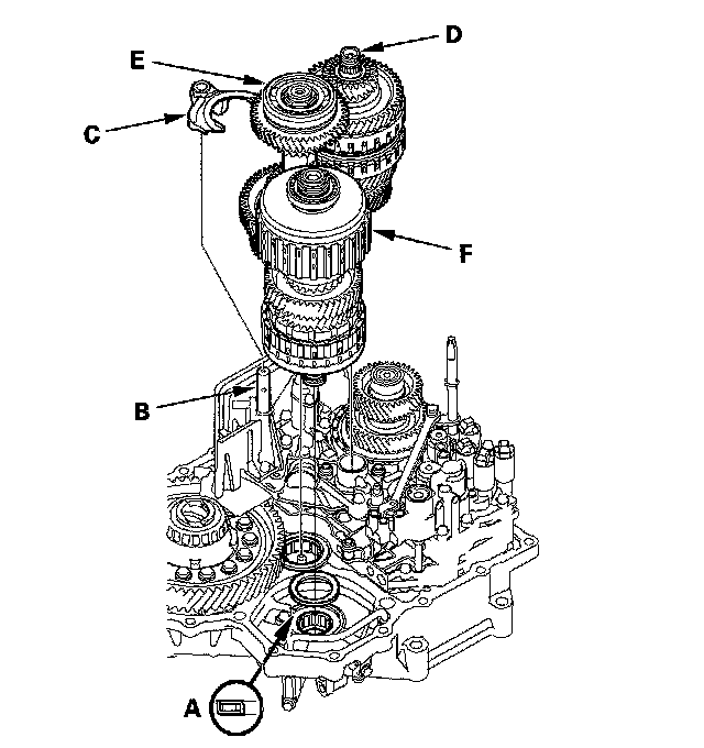 25. Engage the shift fork (C) with the reverse selector on the countershaft, and join the mainshaft (D), countershaft (E), and secondary shaft (F), then install them in the torque converter housing and shift fork on the shift fork shaft.