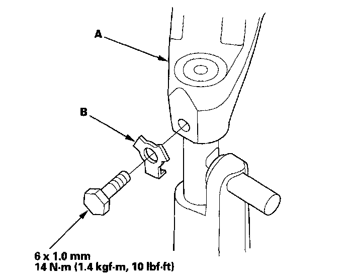 26. Secure the shift fork (A) to the shift fork shaft with the lock bolt and the new lock washer (B), then bend the lock tab of the lock washer against the bolt head.